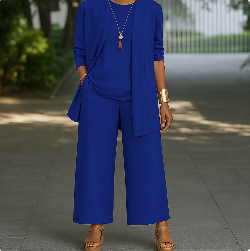 Ontwerp: Inclusief bijpassend vest, aansluitende top en wijde broek voor een complete, samenhangende look.